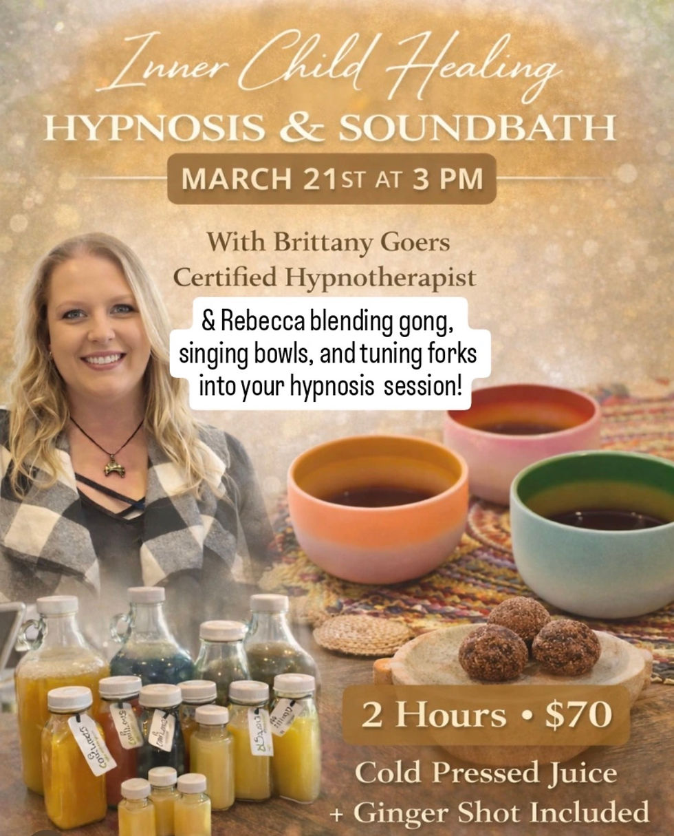 On March 21st at 3pm, join us for a deeply transformational 2 hour Inner Child Healing experience with certified hypnotherapist Brittany Goers and Rebecca Vom Feldt who will be blending the hypnosis with a sound bath.